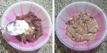 (1)将猪肝放在案板上切成片,用清水浸泡尽量去掉猪肝中的血水,捞出控干一些水分。