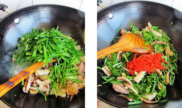4、在鱿鱼打卷的时候倒入韭菜段和红辣椒继续翻炒。