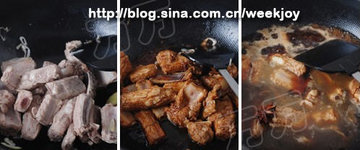 3.放入排骨翻炒一下后倒入生抽和老抽,加水没过排骨2cm左右,放入八角,大火烧开后转中小火继续炖40分钟.