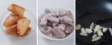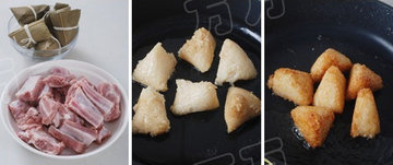 1.排骨入冷水中浸泡30分钟,泡出血水。煎锅里热3汤匙油,放入剥好的粽子,小火煎至通体金黄。盛出备用