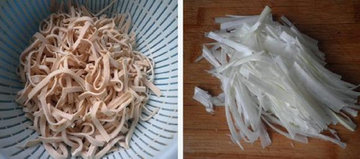 1、豆腐皮切段再切丝,入开水锅中煮透捞出过凉沥水备用。