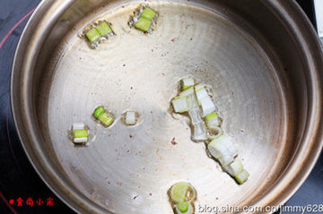 3、煸炒的花椒油里放入葱末煸炒出香味。