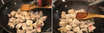 3、加入籽排翻炒几下以后加入绍酒。