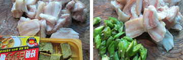1、把五花肉切片,咖喱弄成小块备用,青椒切碎如图所示: