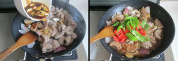 3、 炒制时,先爆香洋葱,再放入腰花,倒入碗汁翻炒,使得腰花均匀的裹住碗汁后放入青红辣椒片,翻炒几下即可,整个炒制时间不宜过长。
