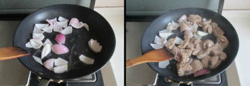 9、 烧热锅, 放少许油, 下入洋葱煸炒。
