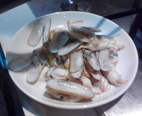 1、先用开水焯,等蛏子的壳稍微开口了就可以捞起。