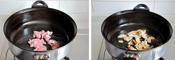 2.中火,炒锅倒豆油,待油烧开后,放肉片,炒制变色,放大蒜碎;