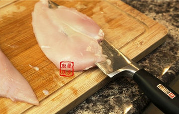 1、先将鸡胸肉洗净,擦干,对半切开,注意最后别切断,这样可以对半摊开成为一大片鸡肉。