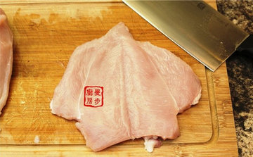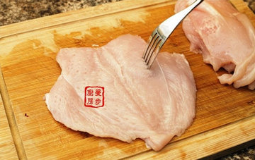 2、鸡排切好后用叉子戳几下鸡肉,这样容易入味,而且纤维戳松了,成品口感更嫩。