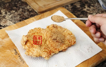 8、将回锅炸好的鸡排沥干油分,装盘,盘子里垫一张厨房纸可以用来吸收多余的油分,然后撒上椒盐粉。
