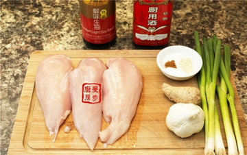 主料:鸡胸肉3块,大蒜3瓣,姜3片,葱4-5支,盐1茶匙,糖1茶匙,胡椒粉12茶匙,五香粉12茶匙,生抽2茶匙,绍兴酒2茶匙