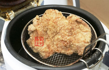 7、把铺地瓜粉的鸡排放入150度油中炸2分钟以后取出,再将油温调高至190度,再炸2分钟即可!