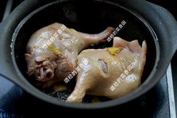 2、锅里不放油,因为鸭肉受热本身就会出很多油,切几片生姜丢进去,再放入鸭腿,转小火慢慢煸。