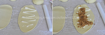 6.放上适量的肉松,然后从上往下卷起来,卷的时候两边往里收,弄成橄榄形