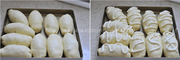 8.最后烤箱上下火180度,面包表面再挤上一层沙拉酱,放在烤箱中层烤18-20分钟即可
