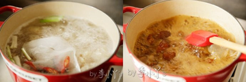3、锅里的水煮开后边煮边用勺子撇去浮末,撇干净为止,然后烹入生抽、老抽、料酒、冰糖,接着投入葱姜和香料袋,转小火,盖上盖子焖3小时左右,开盖放入盐调味后转大火收汁即可。