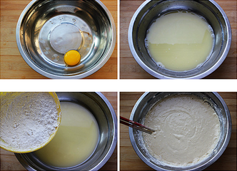 2、在一个盆里磕入鸡蛋,打散,倒入1碗清水,加入适量面粉,调成稀稠合适的面糊