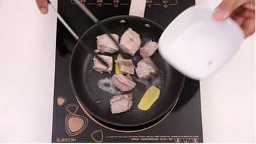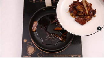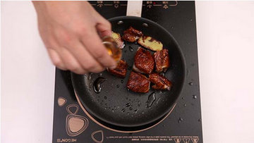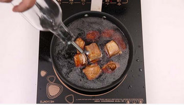 3. 多翻炒排骨,充分上色后,倒入1汤匙料酒,倒入水没过排骨。