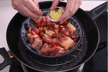 3.把排骨放在碟上,洒上姜蓉及杞子,隔水煎15分钟至全熟。