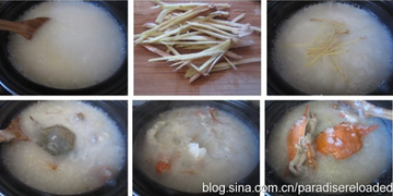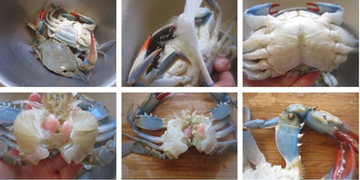 6. 煲粥时处理螃蟹。螃蟹吐水两天,清洗收拾干净,鳃和胃去掉,对半斩开。