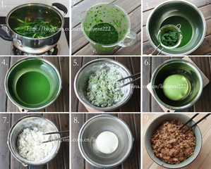 5.取约150毫升的菜汁,倒入面粉中,一边倒一边搅拌成棉絮状;