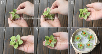 20.最后放入少许胡萝卜末装饰,制成翡翠花朵饺生坯;