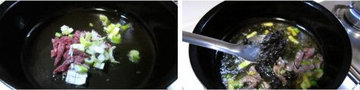 2、炒锅倒油,放葱花和牛肉炒香,加料酒,放橄榄菜