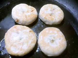 3 、起油锅放入包好的馅饼煎至两面金黄熟透即可。