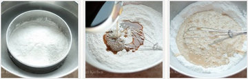 5、所有粉类过筛,缓缓倒入红枣水,拌匀至没有粉粒。