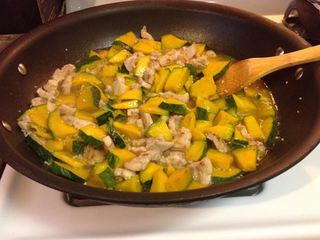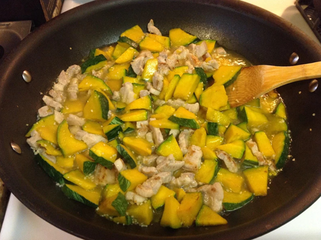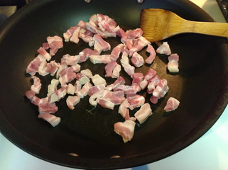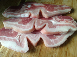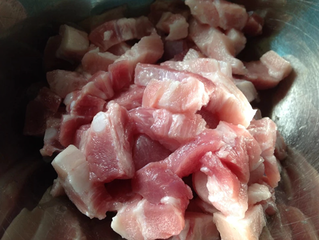 10 、将平底锅热锅,放少许油,将切丝的五花肉入锅,中小火炒约2-3分钟。