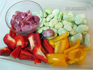 主料:猪肉片100g,皇帝豆170g,黄椒1/4 颗,红椒1/4 颗