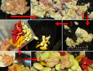 3 、1.2.打水拌匀的肉片入锅微炒至7分熟后捞起 3.拍松的蒜片入锅爆香 4.加入全部蔬菜(皇帝豆的口感会依入锅时间而有软松的差异,想吃松脆可同步下锅) 5.锅边淋少许水份可以加速熟成的速度,拌匀后调味即可起锅。