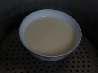 2 、豆浆蛋液过筛,过筛二次口感较细致光滑,将耐热的容器倒入过滤后的豆浆(倒入后如有气泡将它消除,豆花会较光滑),锅内垫铁网架将容器放入,加量杯7格的水,锅盖放根筷子留小缝 (如容器较大,水量请斟I增加)。