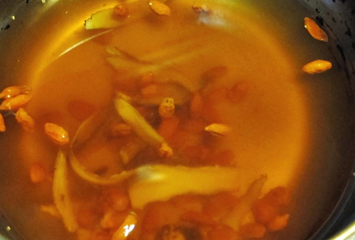 3 、晒干的中药材先过水冲去杂质,放入酒水里加热泡煮出味后调味放凉(有香气就能熄火了不用等到滚)。
