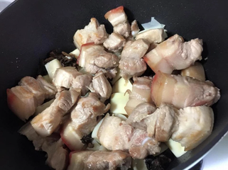 6 、加入适量的冰糖、酱油与白胡椒调味。梅干菜本身在腌渍过程中已有咸味,会随着炖煮时间加长而释出,所以调味时要先尝过味道再加入酱油喔!然后转成小火炖煮40分钟即可。