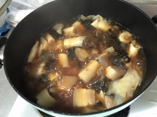 5 、同锅放入桂竹笋、梅干菜与猪肉,并加水到淹过食材,开大火煮滚10分钟。