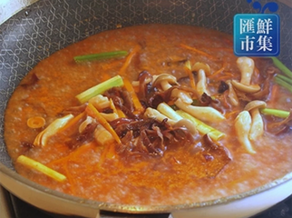 5 、锅中留少许油,放入辣椒、红萝卜及木耳、白松菇,以小火炒香,加入所有调味料煮至滚开。
