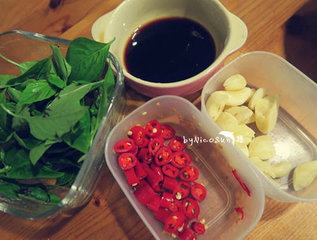2 、辣椒蒜头切末.九层塔洗净剥除艮.酱汁调好备用。
