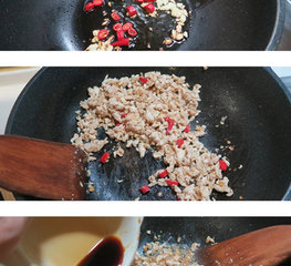3 、爆香蒜末辣椒.放入鸡肉拌炒至7.8分熟.加入酱汁。