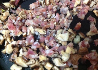 1、腊肠蒸熟切丁、香菇泡软, 两者先炒出香气,放凉。