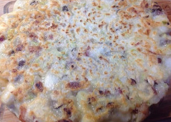 3、中筋面粉、糯米粉、蛋加水调匀, c、胡椒粉、糖调味, 加入1食材拌匀,平底锅抹上一层油 , 两面煎赤赤(小火,可用盘子辅助翻面)。