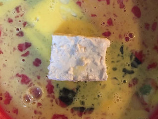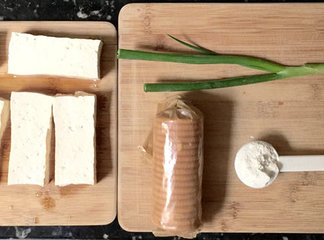 主料:鸡蛋一颗,中筋面粉3 大匙,板豆腐一盒,酥脆饼干8 片,葱一根