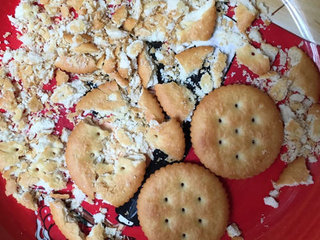 酥脆的部分用在超市买的一大箱酥脆饼干里面压成饼干屑来做,这样既不用再买面包粉,也可帮忙消耗掉吃不完的饼干啊!