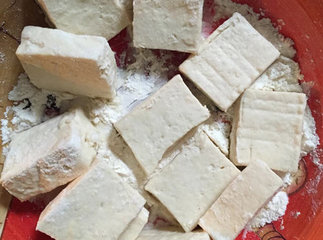 4 、鸡蛋打散,将已经裹粉的豆腐沾上蛋液。