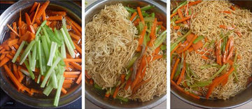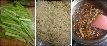 7、放上芹菜和胡萝卜丝,加一碗水或者高汤,煮开,期间调入盐生抽和老抽及胡椒粉。(这里可以用其它香料粉,自己调整,喜欢就好)这里煮开就可以了,不要将菜煮的太烂,欠生就成,因为后面还要蒸呢,太烂不好吃。