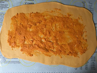 12 、将面团杆成长方形后,整形成约8-9颗馒头 (有多蒸的地瓜,我用叉子压成泥,涂一层到面团上)。