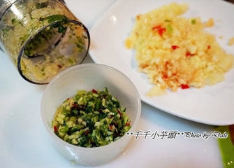 2 、将蒜头,香菜及辣椒切成细末备用 (怕辣的朋友,辣椒可放少许或将辣椒籽去除减少辣度)。