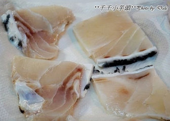 3 、将鱼片的水份擦干,{上海盐(可避免沾锅,也可让鱼肉较有味道)。