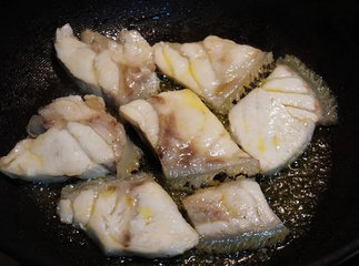 4 、冷油放入鱼片,用中火慢煎至鱼片8分熟后起锅备用(想要有焦焦口感起锅前可用大火快煎)。